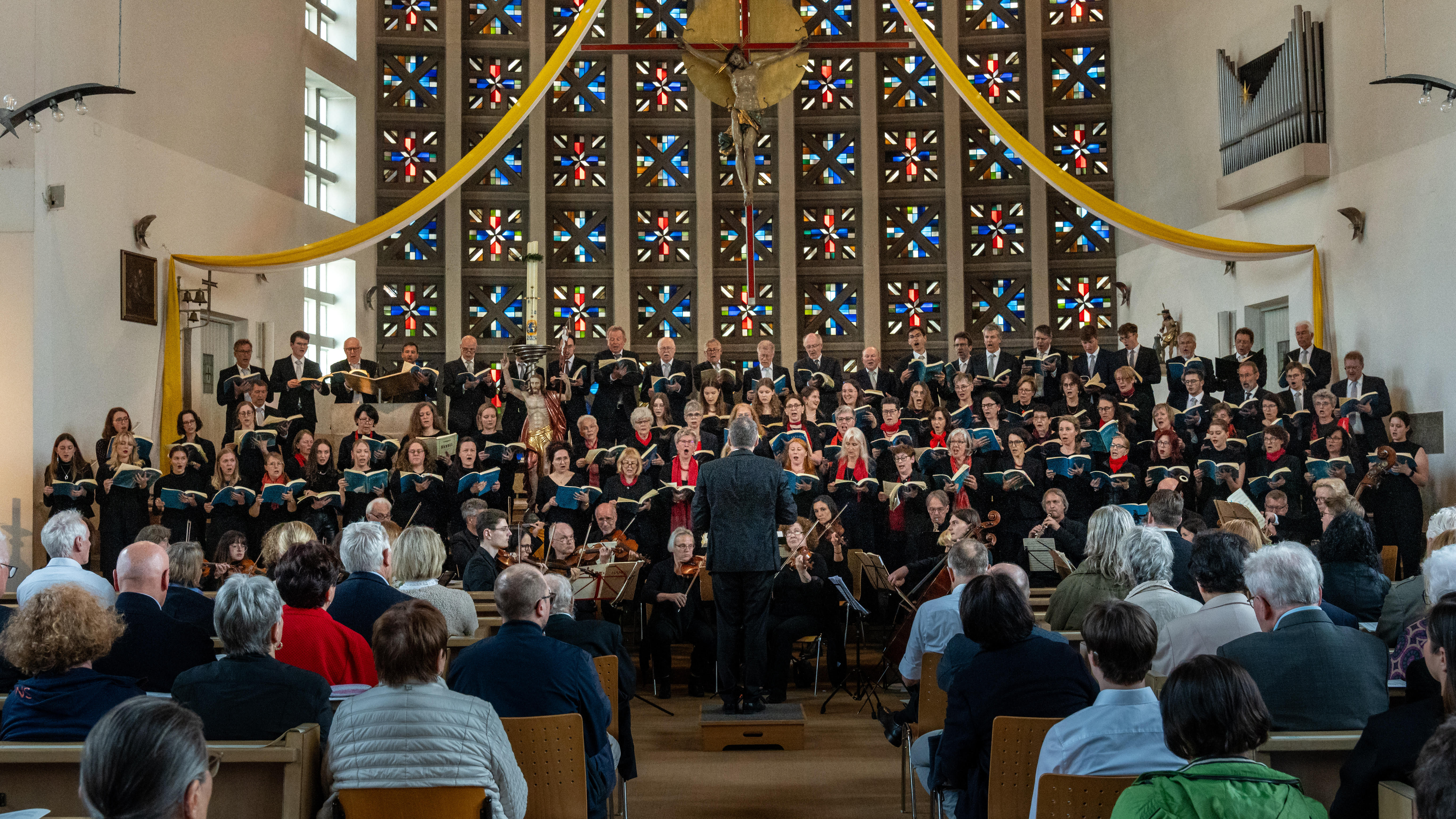 - Chororgel auf und hinter dem Orgelbalkon von 1965 in der Nordwand,