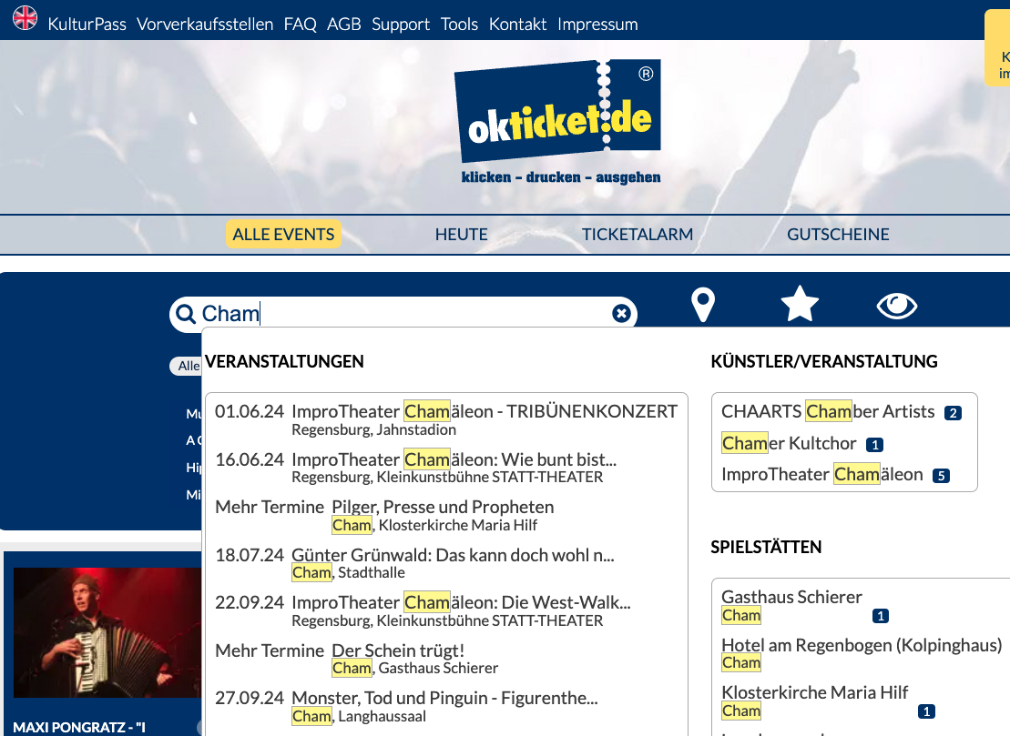 Aber auch sehr komfortabel, z. B. als Mitglied von ok-ticket, kann man nach aktuellen Veranstaltungen, sortiert nach div. Kategorien, suchen: